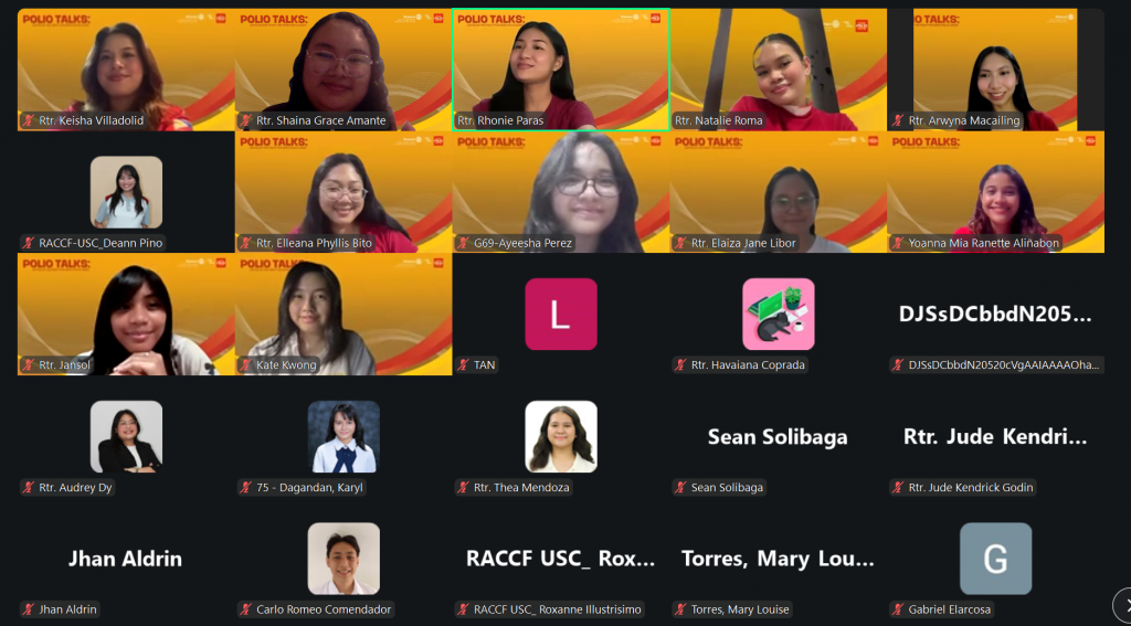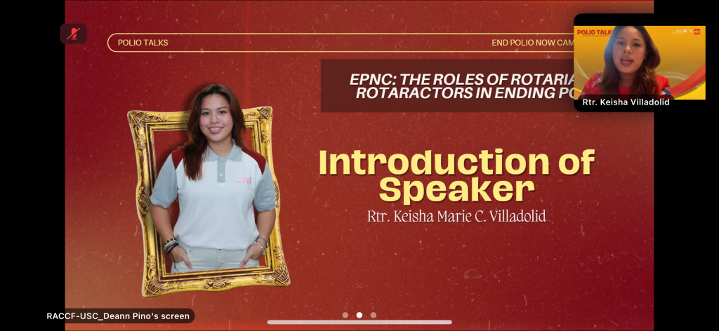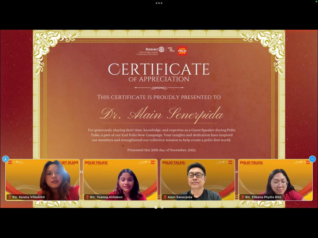 Last November 30 at 7:00 PM, the Rotaract Club of Cebu Fuente–University of San Carlos successfully conducted Polio Talks via Google Meet—an initiative aligned with the club’s ongoing End Polio Now Campaign (EPNC). Held amid calamities and relief efforts, Polio Talks reflected the resilience of service and the urgency of health advocacy.