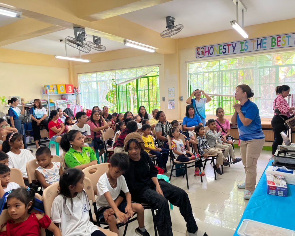 Students, parents, and teachers listen attentively as the Rotaract Club of Lucena South leads an engaging discussion on the importance of Go, Grow, and Glow foods for healthy growth and learning.